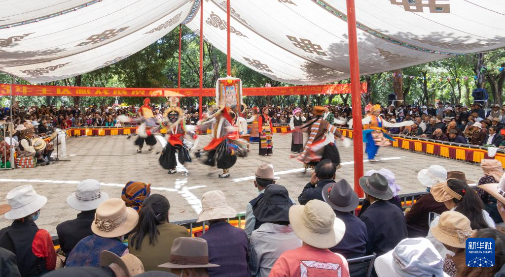 8月19日,在拉薩市羅布林卡園林內(nèi),貢嘎縣乃薩藏戲隊在表演藏戲《朗薩雯崩》。新華社發(fā)(丁增尼達攝)