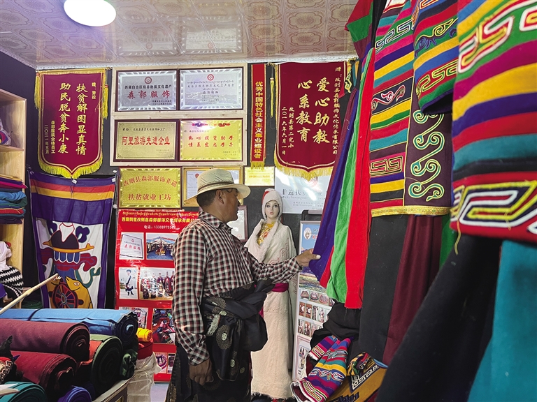 8月的阿里天高云淡,在藍天白云的映襯下,阿里地區(qū)改則縣努拉老人的工坊內,一件件五彩服飾如同彩虹般絢麗奪目。工坊內,努拉老人正在聚精會神地縫制手中的布料,經過他的巧手,一件“森郭服飾”的雛形就此產生。