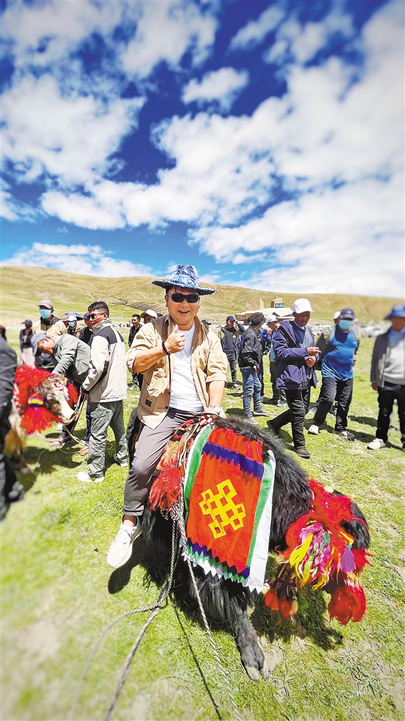 圖為來自湖南的游客李先生在牧人節(jié)賽牦牛項(xiàng)目中,體驗(yàn)騎牦牛的刺激與歡樂。見習(xí)記者 武沛濤 攝