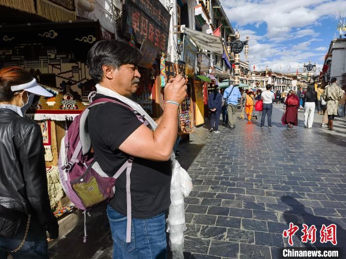 9月19日,阿根廷資深媒體人、作家伍志偉(Gustavo Emilio Ng)參觀拉薩八廓街。中新社記者 趙延 攝
