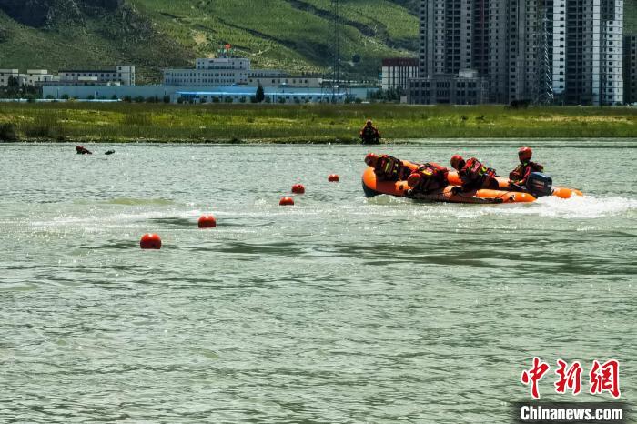 圖為參賽隊員在水域救援比武現場。昌都市森林消防支隊 供圖