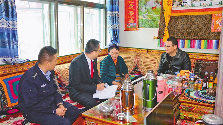 普瑪江塘中心法庭負(fù)責(zé)人巴桑次仁(左)正在向務(wù)工人員了解相關(guān)情況。