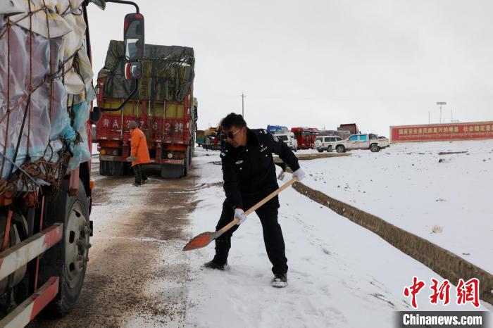 “現(xiàn)在唐古拉山路段處于不間斷堵車狀態(tài),昨天我們這一隊(duì)是從下午開始除雪保通,持續(xù)到今天凌晨4點(diǎn)左右才全部疏通?!?1日下午,中新網(wǎng)記者連線西藏安多縣公安局交通管理中心秩序中隊(duì)隊(duì)長(zhǎng)達(dá)娃云旦,他介紹,10月17日以來,國(guó)道109線唐古拉山段持續(xù)降雪,積雪結(jié)冰,道路通行受阻。安多警方“以雪為令”全力救援被困乘客、車輛,進(jìn)行除雪保通。