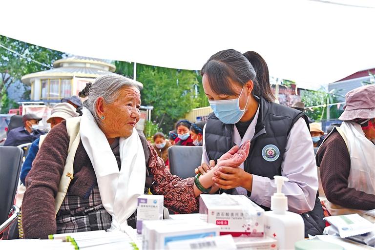 圖②:桑珠孜區(qū)志愿者為老年人免費義診。 記者 扎西頓珠 攝