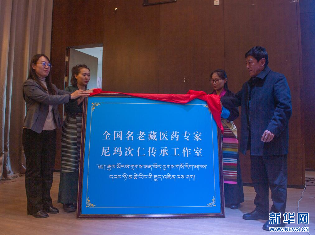 10月26日,西藏自治區(qū)藏醫(yī)藥管理局副局長王曉燕(左一)和岐黃學(xué)者、全國名老中醫(yī)藥專家尼瑪次仁(右一)共同揭牌傳承工作室。新華社記者 旦增尼瑪曲珠 攝