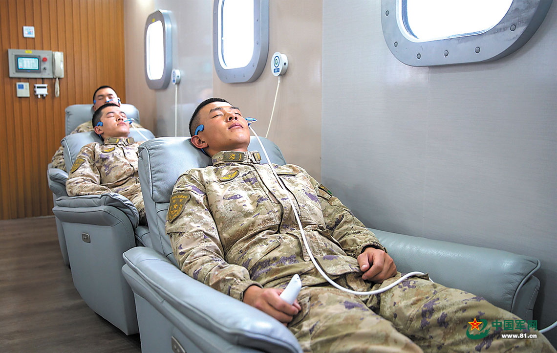 某邊防連官兵在微壓氧艙中吸氧。