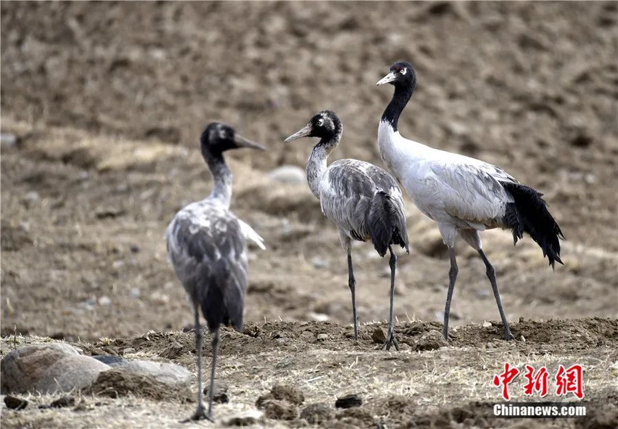 國家一級重點保護野生動物黑頸鶴在西藏拉薩楚布溝的農田覓食。李林 攝