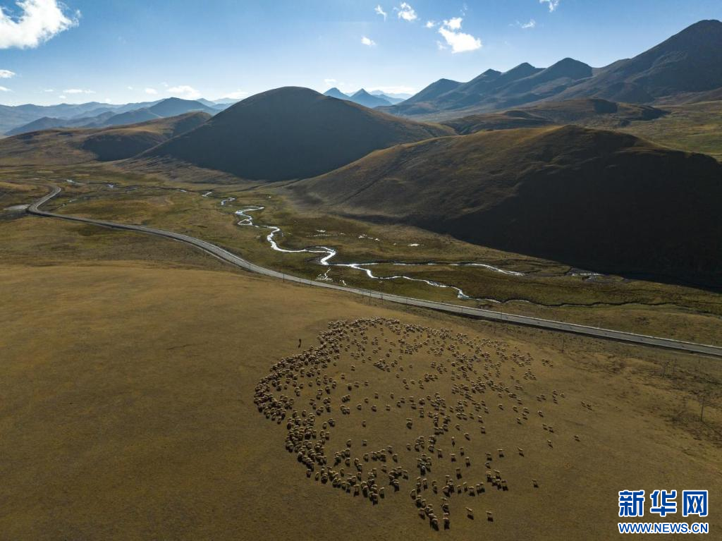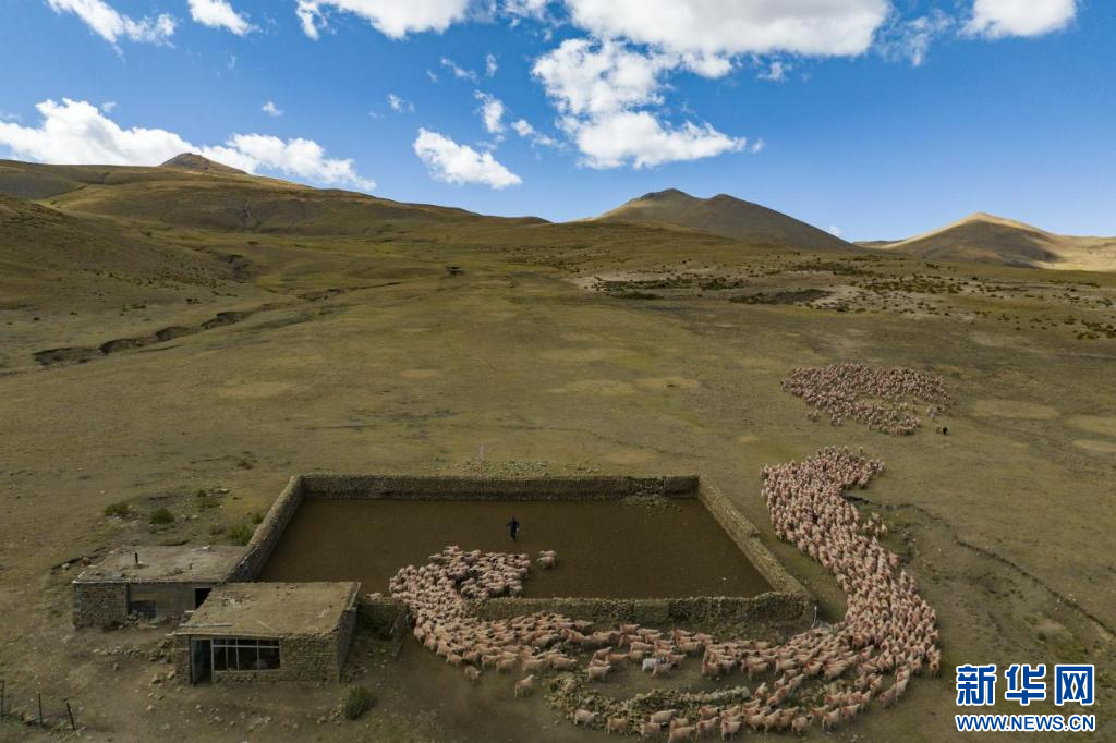 扎西松多村集體養(yǎng)殖的千只綿羊(無(wú)人機(jī)照片)。新華網(wǎng) 旦增努布 攝