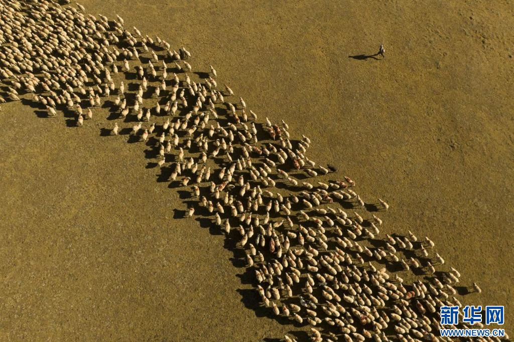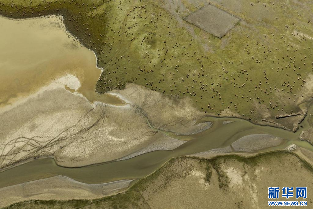 在西藏措美縣境內(nèi)拍攝的羊群(無(wú)人機(jī)照片)。新華網(wǎng) 旦增努布 攝