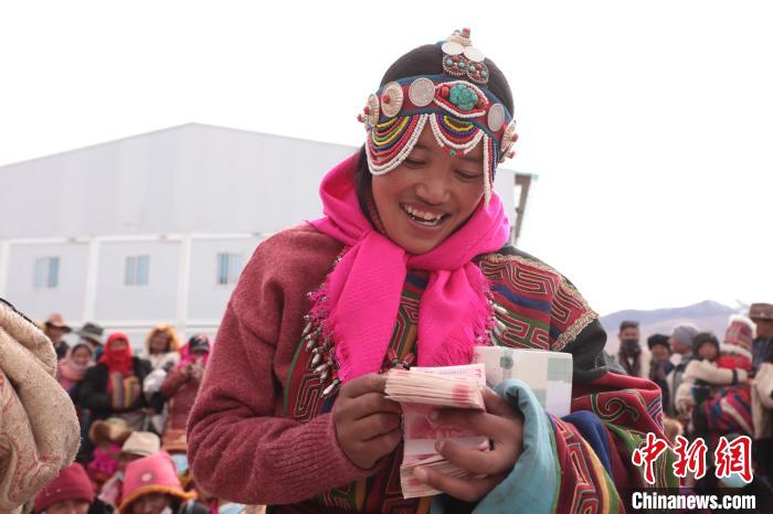 圖為合作社社員領(lǐng)到現(xiàn)金分紅。索朗仁青 攝