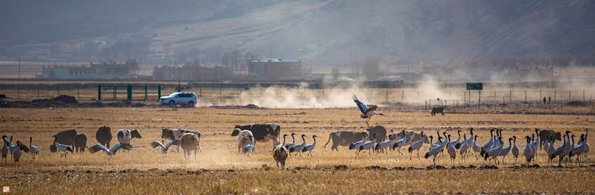 為保護黑頸鶴,林周縣出臺系列措施,專門設立多個定期投食點,安排專人投撒青稞、小麥等黑頸鶴所需食物;成立巡護隊,嚴格實行24小時巡護制度,全力護好黑頸鶴。