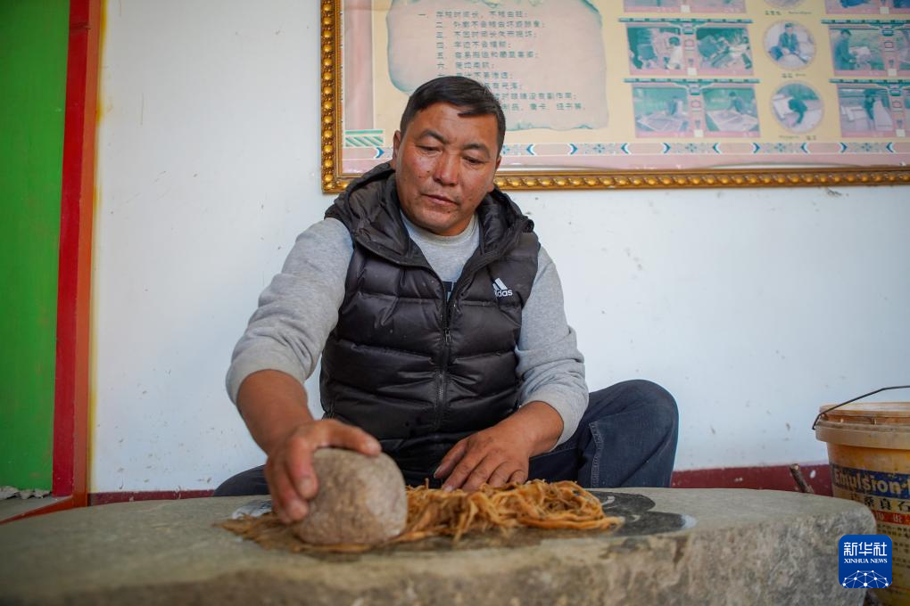 格桑旦增的弟弟普瓊用石頭捶打狼毒草,這是制作藏紙的步驟之一(12月5日攝)。新華社記者 關(guān)明輝 攝