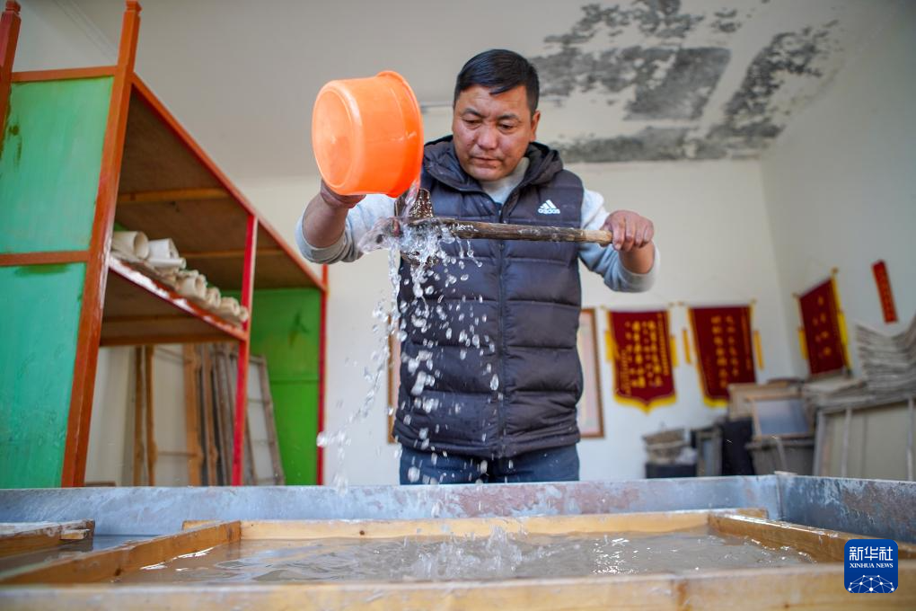 格桑旦增的弟弟普瓊在造紙(12月5日攝)。新華社記者 邵澤東 攝