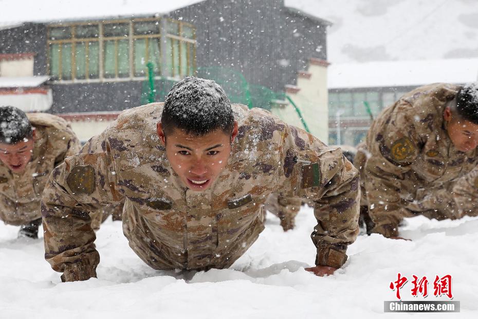 圖為官兵們在雪中做俯臥撐。曾厚望 攝