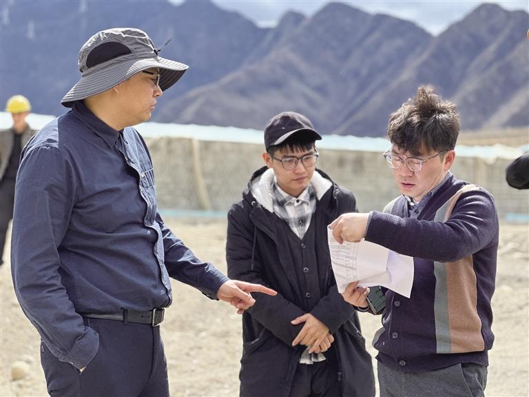 王宇(右一)在援藏項目現(xiàn)場核對施工圖紙。圖由王宇提供