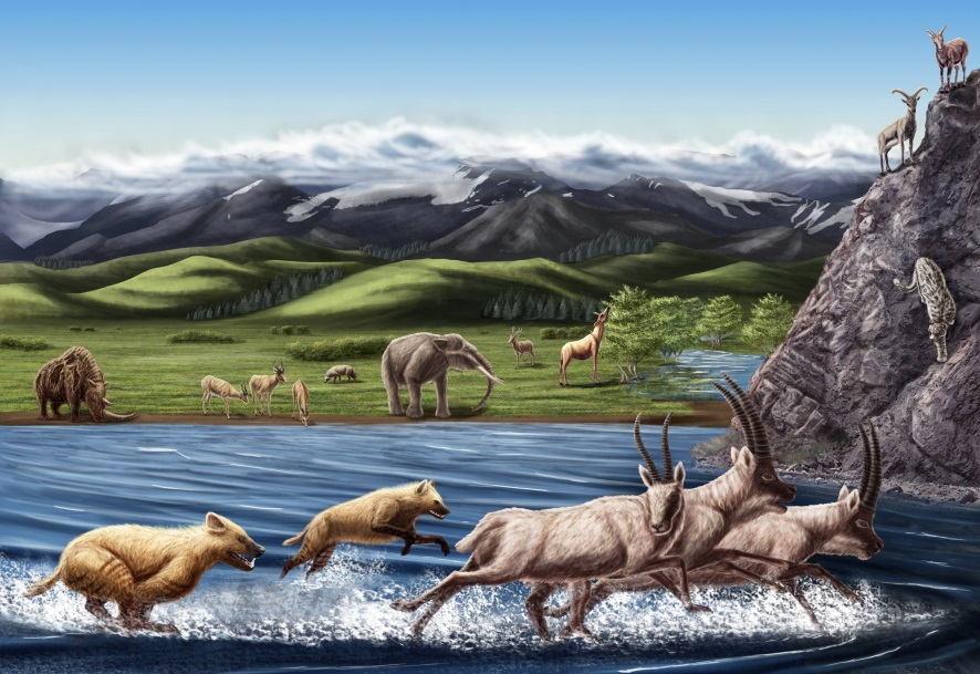 西藏札達(dá)盆地上新世哺乳動(dòng)物群生態(tài)復(fù)原圖。(中國(guó)科學(xué)院古脊椎所供圖)