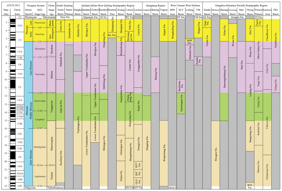 中國(guó)的新近紀(jì)年代地層系統(tǒng)分為中新統(tǒng)的謝家階、山旺階、通古爾階、灞河階、保德階5個(gè)階,以及上新統(tǒng)的高莊階和麻則溝階2個(gè)階。研究提出,在青藏高原新生代陸相地層的劃分對(duì)比和測(cè)年標(biāo)定上,哺乳動(dòng)物化石起到非常重要的作用。