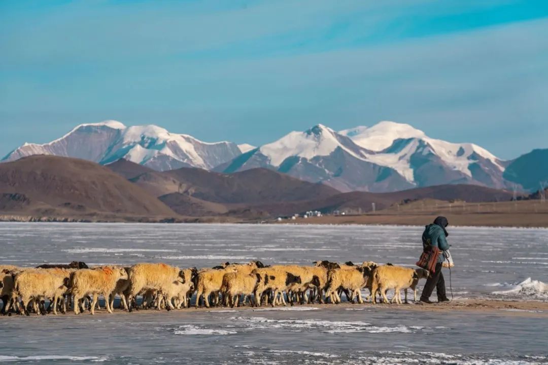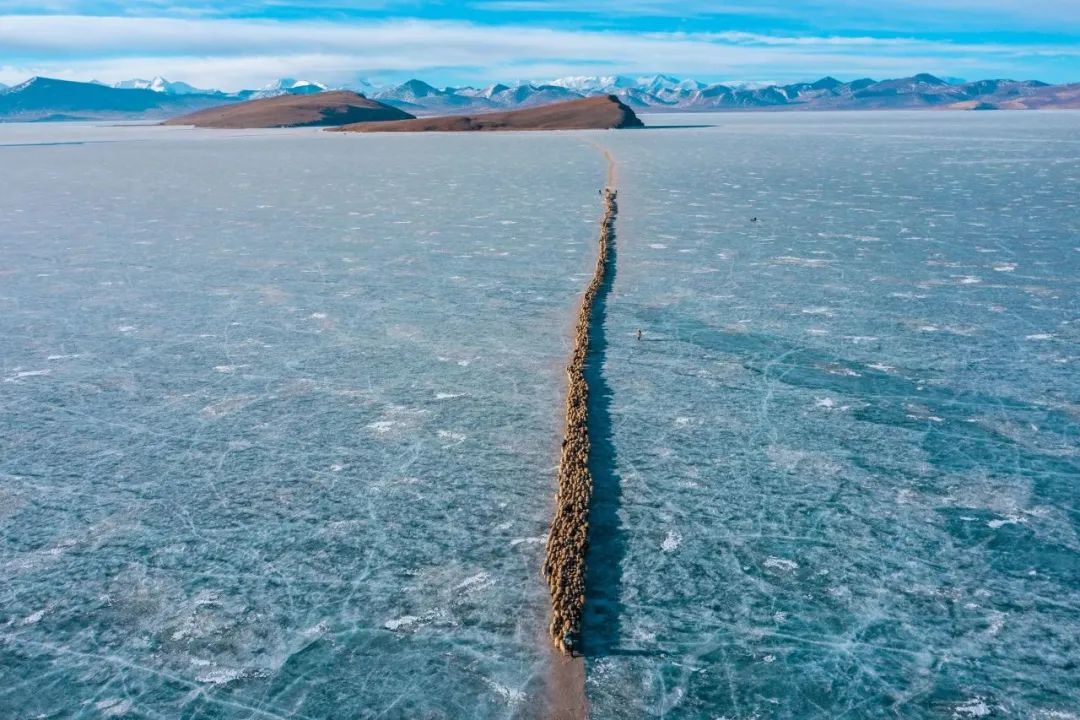 它是世界上海拔最高的村落之一,當(dāng)?shù)卮迕穸家苑拍翞樯:瑏?lái)臨,岸上的牧場(chǎng)草料已經(jīng)不夠羊群過(guò)冬,推瓦村的村民們把羊群集結(jié)在一起,在冰湖上撒牛糞爐灰,畫(huà)出一道冰面上的“羊腸小道”把羊群趕上普姆雍錯(cuò)湖心島上吃草過(guò)冬,雖然只有幾公里的距離,但這個(gè)傳承千年的畫(huà)面卻給人以史詩(shī)般的震撼與感動(dòng)。