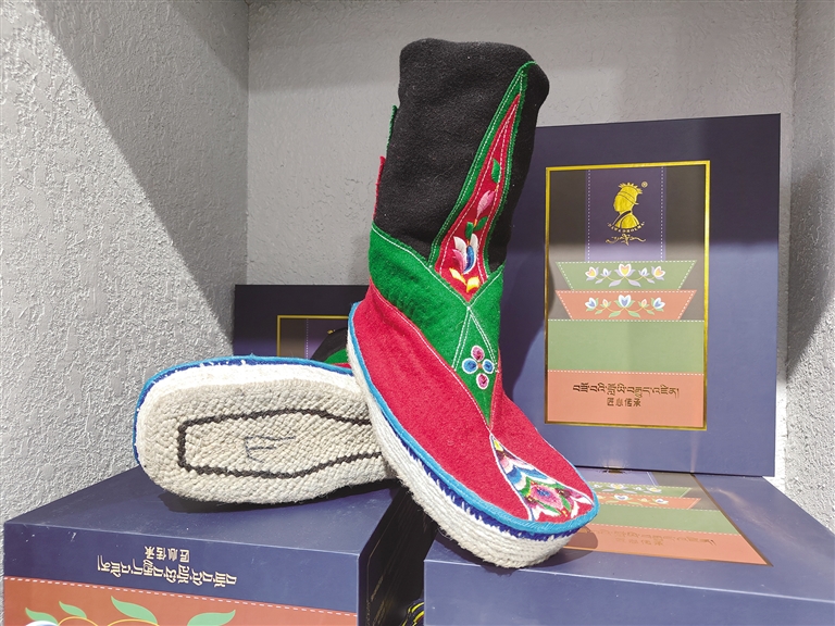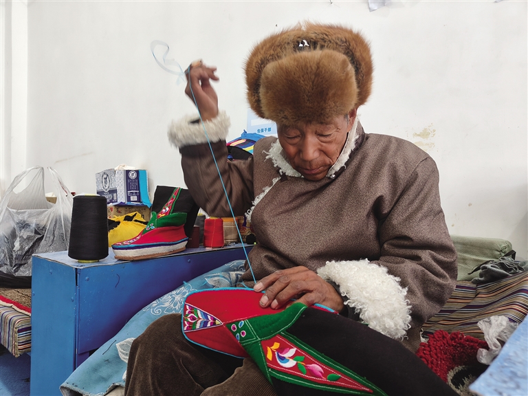 “藏靴樣式精美、花色靚麗,因材質(zhì)和花色的不同分為‘郭扎’‘郭朵’‘松巴’三種?!枪?jié)慶時(shí)穿,‘郭朵’‘松巴’可以日常穿,制作一雙藏靴需要一周左右的時(shí)間。這些藏靴不分左右,磨損后可以互換,還可以防潮防寒?!闭诳p制藏靴的索朗頓珠雙手稍顯粗糲卻不失靈巧,他邊飛針走線,邊給記者介紹著手中的藏靴。厚而輕的鞋底、柔軟的靴面,五顏六色的絲線繡出栩栩如生的多瓣蓮花,加上氆氌制成的鞋面,一雙極具民族特色的藏靴展現(xiàn)在眼前。