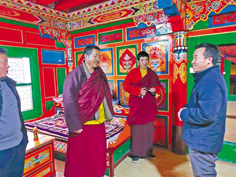 2023年11月17日,自治區(qū)人大代表段世昌(右)在昌都市江達(dá)縣汪布頂鄉(xiāng)根沙寺了解寺廟“三個(gè)意識(shí)”宣傳教育開(kāi)展情況。