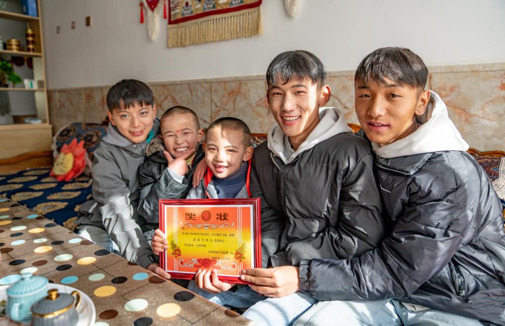1月8日,“幸福家庭”的孩子們展示獎狀。新華社照片,拉薩,2024年1月9日 新華社發(fā)(丁增尼達(dá)攝)
