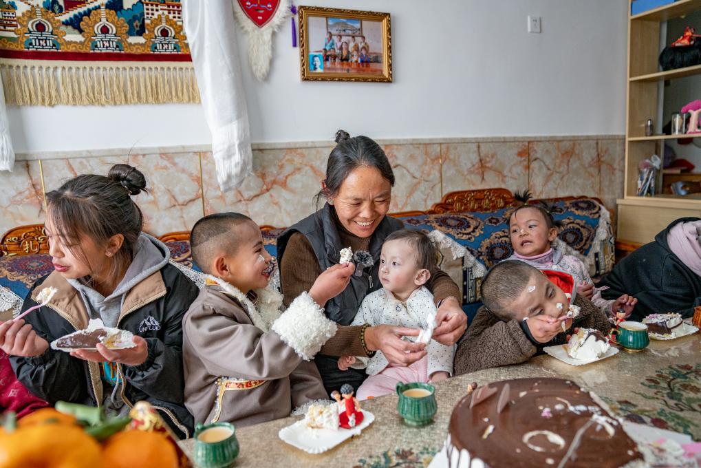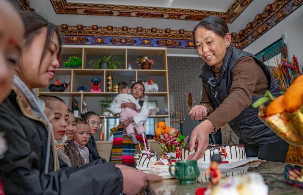 1月8日,愛心媽媽巴桑和孩子們一起吃蛋糕。新華社照片,拉薩,2024年1月9日 新華社發(fā)(丁增尼達(dá)攝)