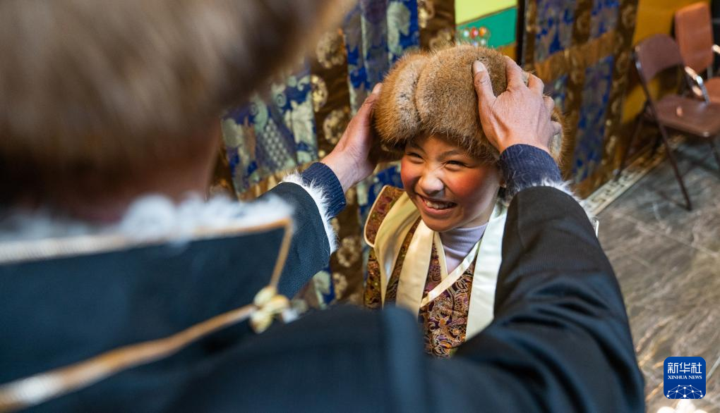 家人為巴桑普尺的孫女益西貴桑佩戴“金花帽”(藏族特色帽子)(1月10日攝)。新華社發(fā)(丁增尼達(dá) 攝)