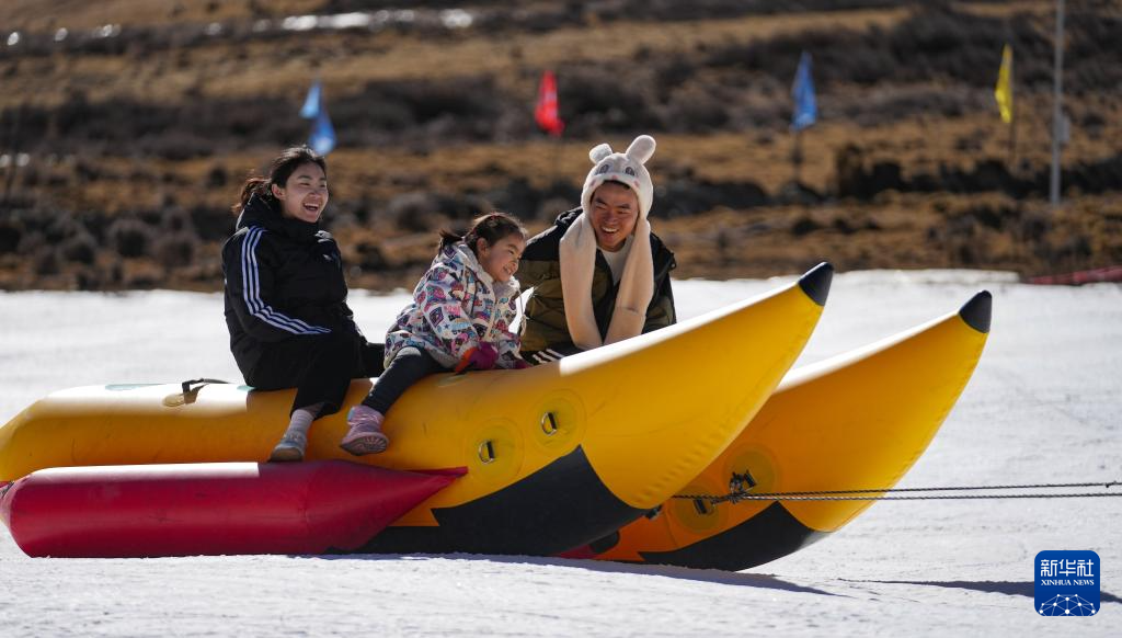 1月13日,游客在墨多滑雪場體驗(yàn)香蕉船嬉雪項(xiàng)目。新華社記者 晉美多吉 攝