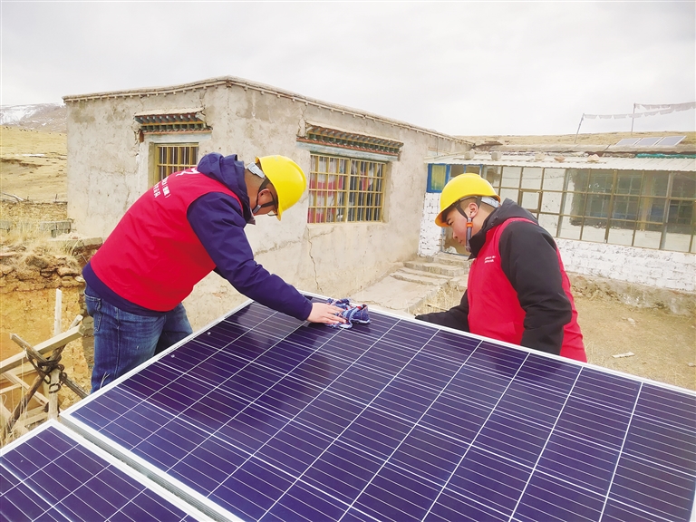 “次桑在家嗎?我們過來看一下你們新年準(zhǔn)備得怎么樣了?”聽到劉光輝的呼喚,孩子們都跑出來迎接這位“小黃帽”叔叔。劉光輝和羅桑歐珠進屋放下年貨,顧不上休息,立馬搭梯子爬上次桑家的房頂,用抹布拂去光伏電板上的塵土,拿出工具仔細檢查電源和光伏設(shè)備是否有損壞?!按紊<矣玫氖俏覀兊牡谝淮柲芄夥姲?,這個電板要經(jīng)常擦拭,保持表面干凈,發(fā)電效率會更好?!眲⒐廨x說。檢修完光伏電板后,劉光輝和羅桑歐珠又回到屋內(nèi)檢查次桑家的電路線路,對插排插座等可能存在安全隱患的地方進行認真排查。確保沒有問題后,兩人將之前昏暗的燈泡全部換成了最新的節(jié)能燈泡,整個屋子一下亮堂了起來。