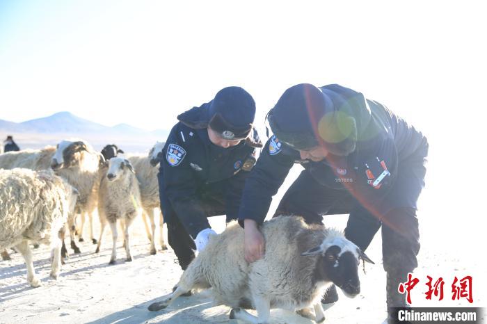 在光滑的冰面上,不時(shí)有小羊摔倒,甚至有“懶惰”的大羊直接“趴窩”不前,民警們不是將他們抱著就是扶著前行。在海拔5070米的冰面上負(fù)重前行,民警大口喘著粗氣,還時(shí)不時(shí)踩滑摔跤,但臉上始終洋溢著幸福的笑容。