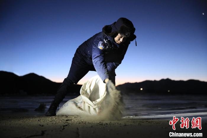 圖為西藏出入境邊防檢查總站浪卡子邊境管理大隊(duì)民警在冰面拋灑牛糞爐灰。彭維熙 攝