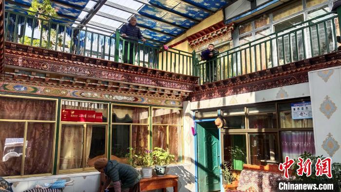“樓上樓下都有陽光,很暖和?!?月2日,西藏網(wǎng)絡媒體新春走基層活動記者一行來到山南市瓊結(jié)縣昌嘎村,此時該村四組村民多吉在家里的二樓陽光房內(nèi)準備過年用的經(jīng)幡,他的老伴則在一樓庭院內(nèi)整理衣物,午后的陽光透過玻璃窗落在沙發(fā)上,坐在這里感覺不到冬的寒意,郁郁蔥蔥的綠植讓這所溫馨的居所生機勃勃。