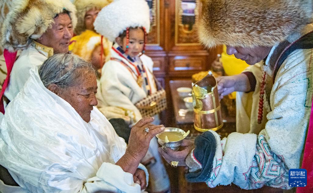 在位于西藏拉薩市當雄縣公塘鄉(xiāng)甲根村的家中,斯曲旺姆正在接受兒女們敬酒(2月10日攝)。新華社記者 孫瑞博 攝