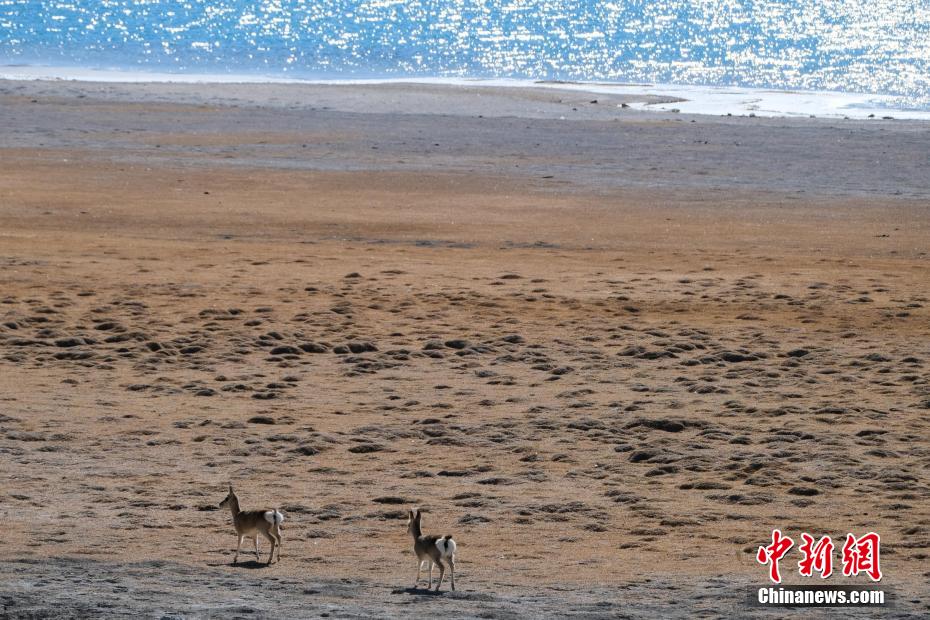 羊卓雍錯(cuò)湖畔,兩只小藏原羚覓食。江飛波 攝