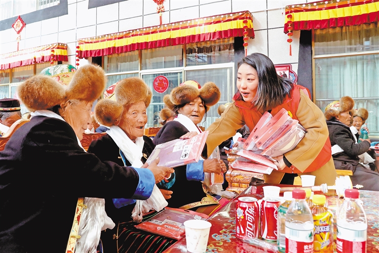 山南市瓊結(jié)縣各單位在縣集中供養(yǎng)中心聯(lián)合舉辦慶元宵活動,為供養(yǎng)中心老人分發(fā)保暖衣物。記者 洛桑 本報通訊員 次仁龍布 攝