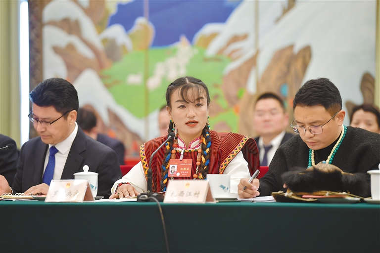 圖為3月6日上午,西藏代表團舉行全體會議,傳達學習習近平總書記在參加江蘇代表團審議時的重要講話精神,繼續(xù)審議政府工作報告,審查計劃報告和預算報告。圖為全國人大代表扎西尼瑪(中)在會上發(fā)言。
