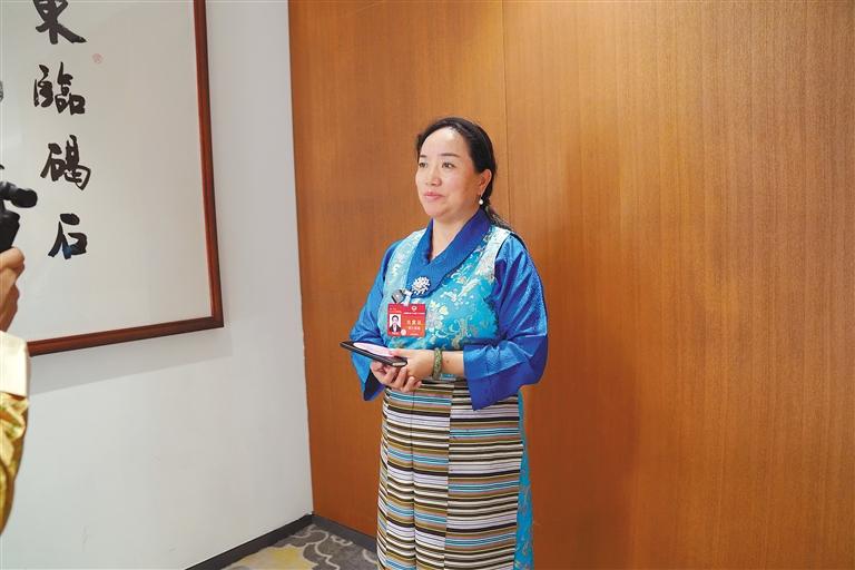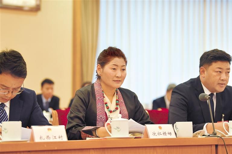 全國(guó)人大代表白瑪措在會(huì)上發(fā)言。 旦增西旦 攝