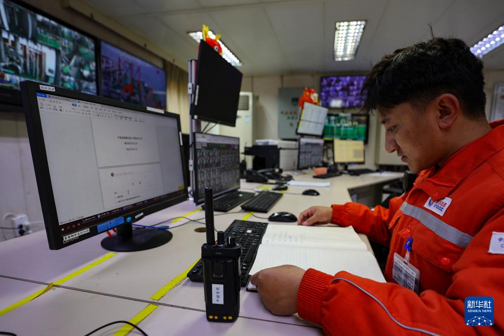 強(qiáng)巴在秦皇島32-6油田“渤海世紀(jì)號(hào)”(FPSO)16萬(wàn)噸級(jí)浮式生產(chǎn)儲(chǔ)油裝置上的中央控制室進(jìn)行參數(shù)核對(duì)和調(diào)整(3月7日攝)。新華社記者 姜帆 攝