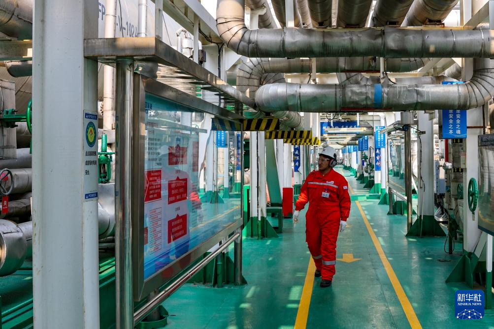 強(qiáng)巴在秦皇島32-6油田“渤海世紀(jì)號(hào)”(FPSO)16萬(wàn)噸級(jí)浮式生產(chǎn)儲(chǔ)油裝置上觀察設(shè)備運(yùn)轉(zhuǎn)情況(3月7日攝)。新華社記者 黃耀漫 攝