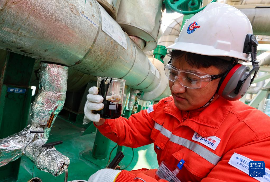 強(qiáng)巴在秦皇島32-6油田“渤海世紀(jì)號(hào)”(FPSO)16萬(wàn)噸級(jí)浮式生產(chǎn)儲(chǔ)油裝置上檢查原油油樣(3月7日攝)。新華社記者 姜帆 攝