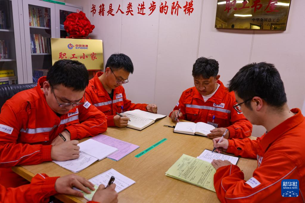 在秦皇島32-6油田“渤海世紀(jì)號(hào)”(FPSO)16萬(wàn)噸級(jí)浮式生產(chǎn)儲(chǔ)油裝置上,強(qiáng)巴(右二)輪班結(jié)束后參加班組總結(jié)會(huì)(3月7日攝)。新華社記者 黃耀漫 攝