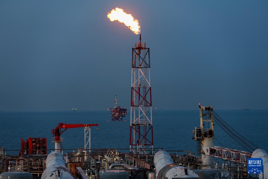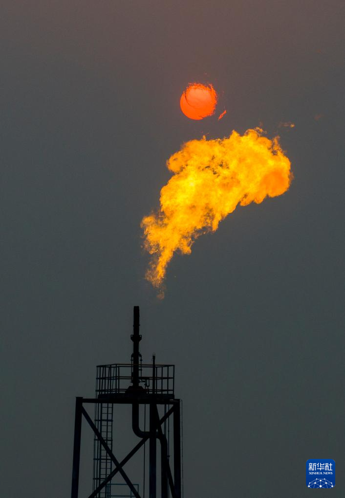 夕陽(yáng)下的秦皇島32-6油田“渤海世紀(jì)號(hào)”(FPSO)16萬(wàn)噸級(jí)浮式生產(chǎn)儲(chǔ)油裝置的火炬(無(wú)人機(jī)照片,3月7日攝)。新華社記者 姜帆 攝