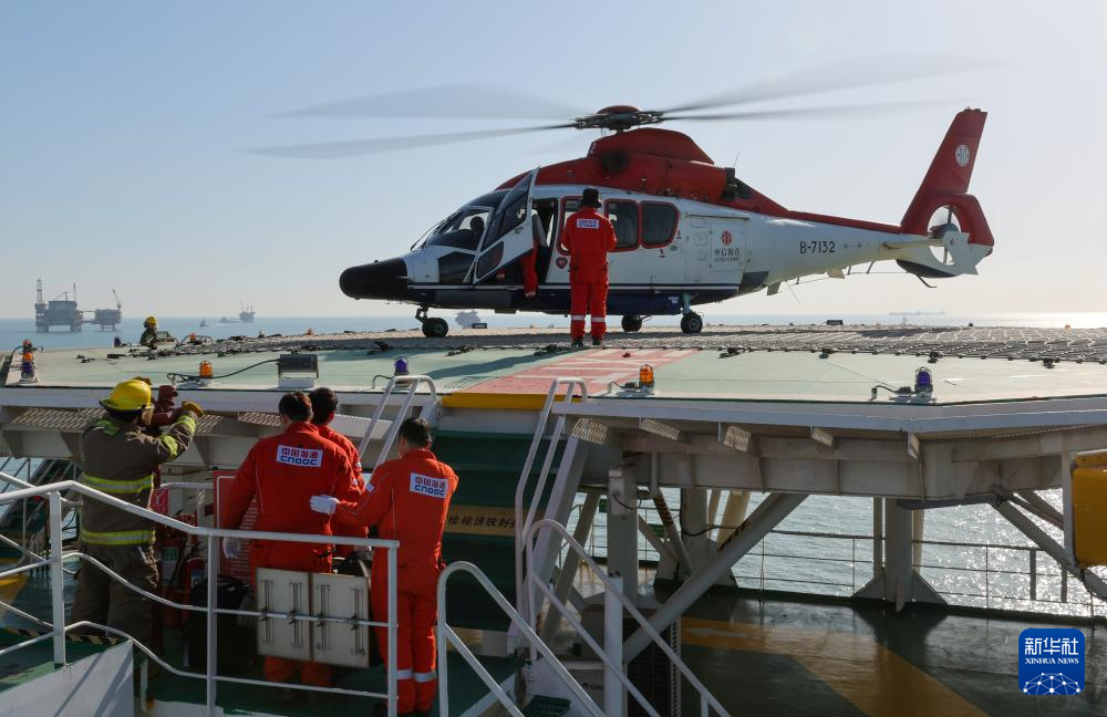 直升機(jī)在秦皇島32-6油田“渤海世紀(jì)號(hào)”(FPSO)16萬(wàn)噸級(jí)浮式生產(chǎn)儲(chǔ)油裝置上降落(3月7日攝)。這是海上石油工人經(jīng)常使用的交通工具。新華社記者 黃耀漫 攝