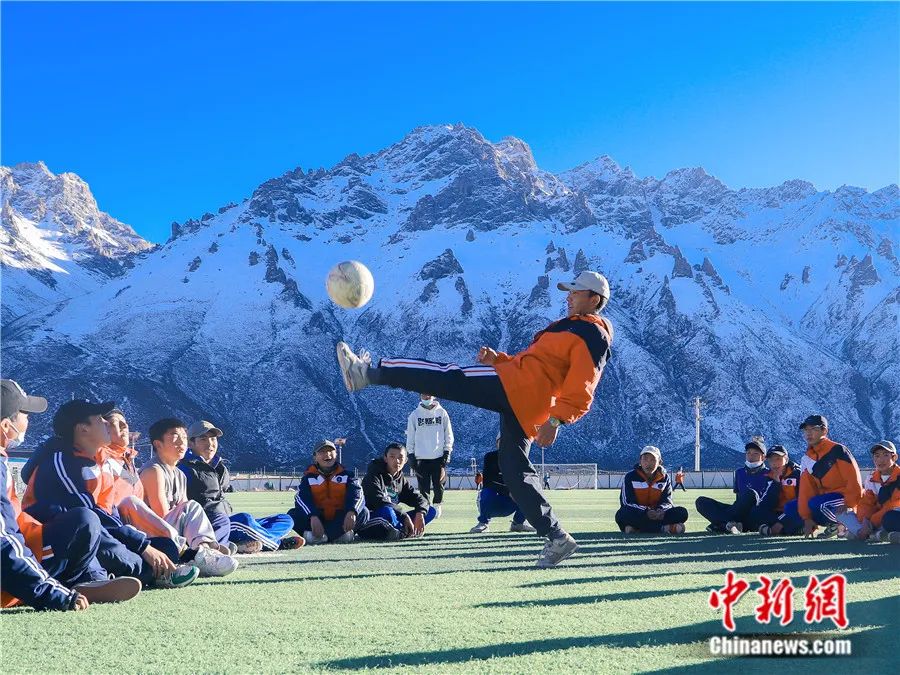 2022年11月25日,西藏那曲市嘉黎縣中學(xué)的高原球場上學(xué)生們在進行足球訓(xùn)練。據(jù)了解,這座海拔4500米的高原球場是全校2500余名學(xué)生上體育課的地方,也是訓(xùn)練足球的場地。色曲多吉 攝