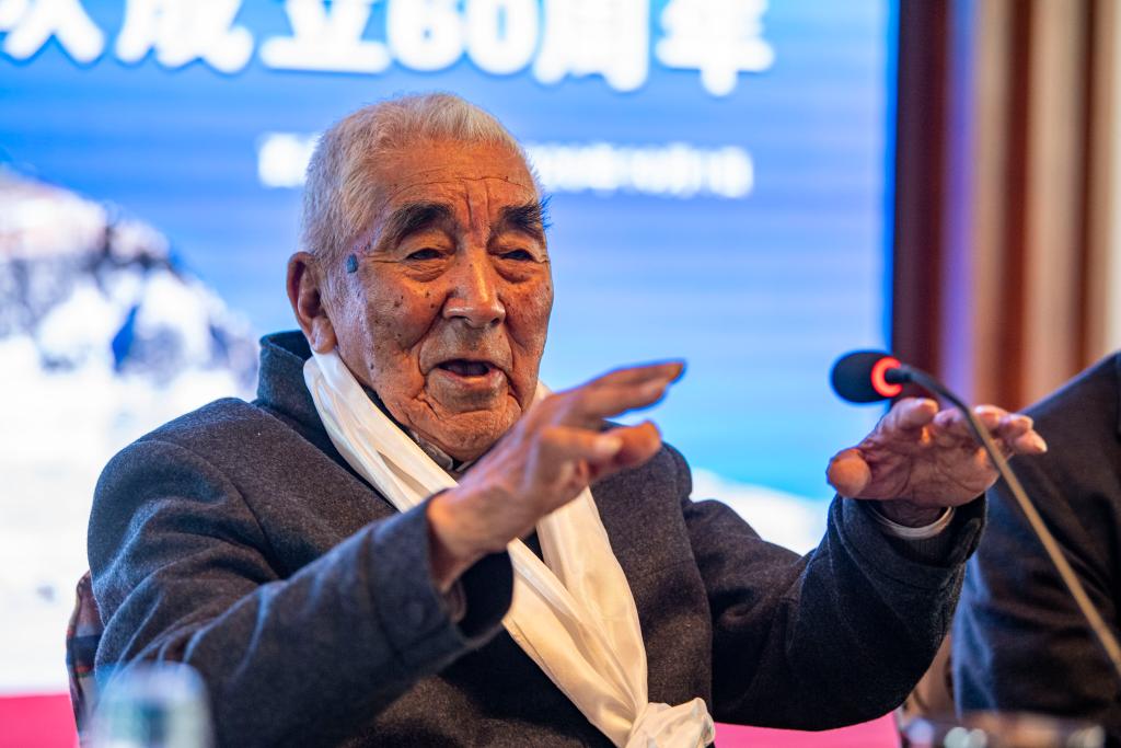 2020年10月1日,87歲高齡的老登山家貢布在慶祝中國西藏登山隊成立60周年活動上致辭。新華社記者 孫非 攝