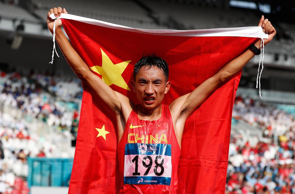 2018年第18屆亞運會田徑男子馬拉松賽中,中國選手多布杰獲得季軍。新華社記者 王麗莉 攝