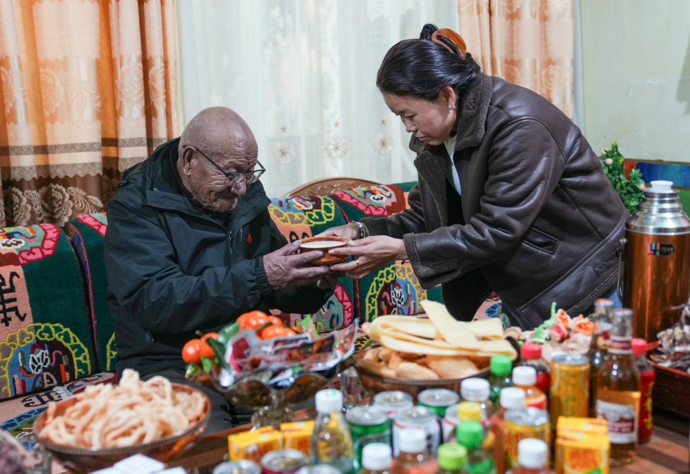 2024年3月14日,在位于嘎東社區(qū)的家中,兒媳普赤給益西桑珠(左)敬茶。新華社記者 晉美多吉 攝