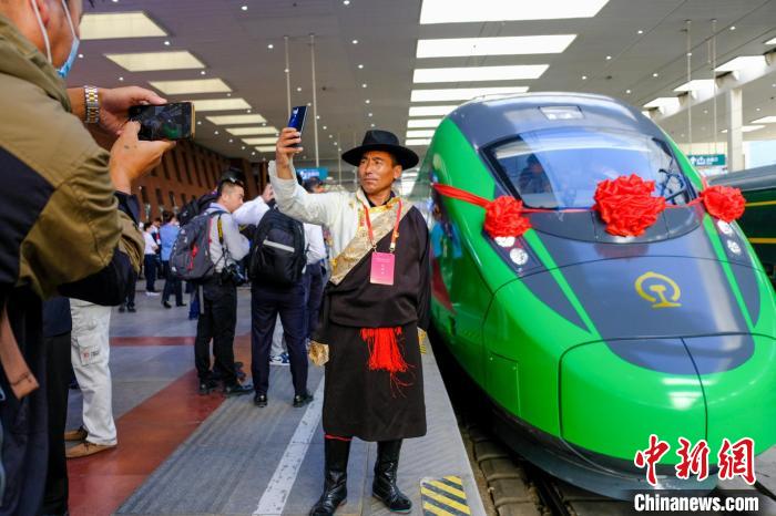 資料圖為2021年6月25日,西藏拉林鐵路開通運(yùn)營(yíng),拉薩曲水縣三有村村民次旦平措在復(fù)興號(hào)前拍照留念。江飛波 攝