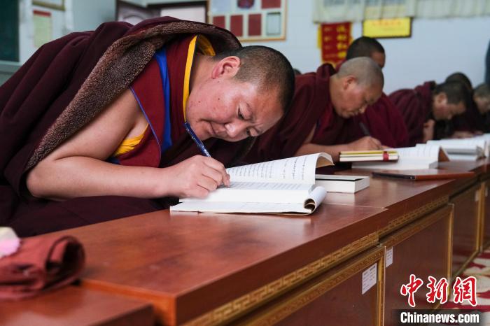 圖為3月28日,西藏佛學(xué)院20級(jí)尼眾(3)班學(xué)員在學(xué)習(xí)經(jīng)文。江飛波