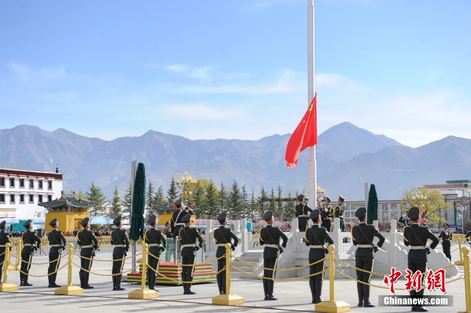 3月28日,西藏各族各界人士聚集在拉薩布達拉宮廣場,升國旗、唱國歌,參加西藏百萬農(nóng)奴解放65周年紀念活動。圖為升國旗儀式現(xiàn)場。中新社記者 貢嘎來松 攝